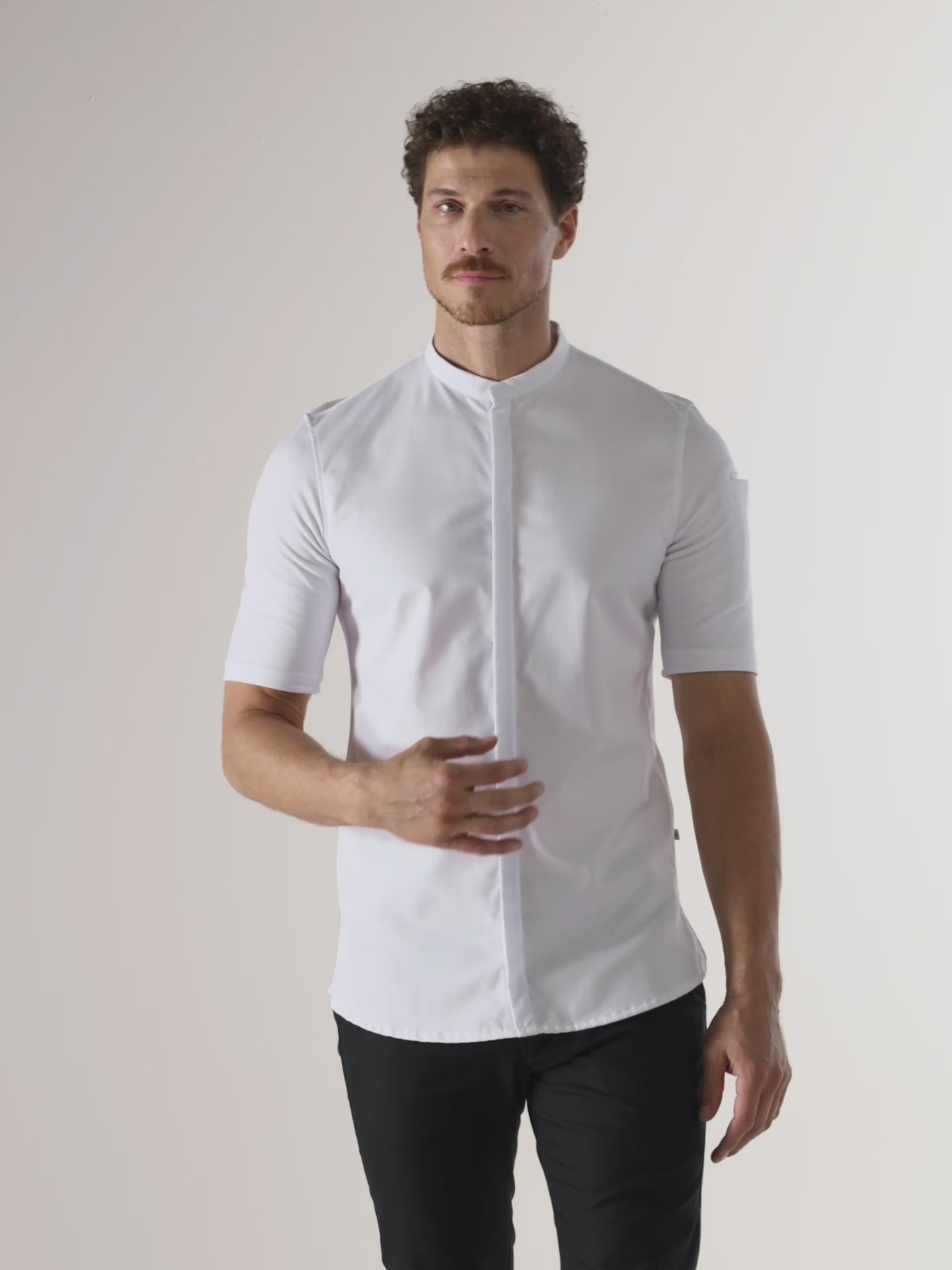 | Caractéristiques du produit | Bolsillo en la manga Botones de presión invisibles Bucle de delantal con botón de presión Cuello mao Le Nouveau Chef H bordado en la manga Mangas cortas |